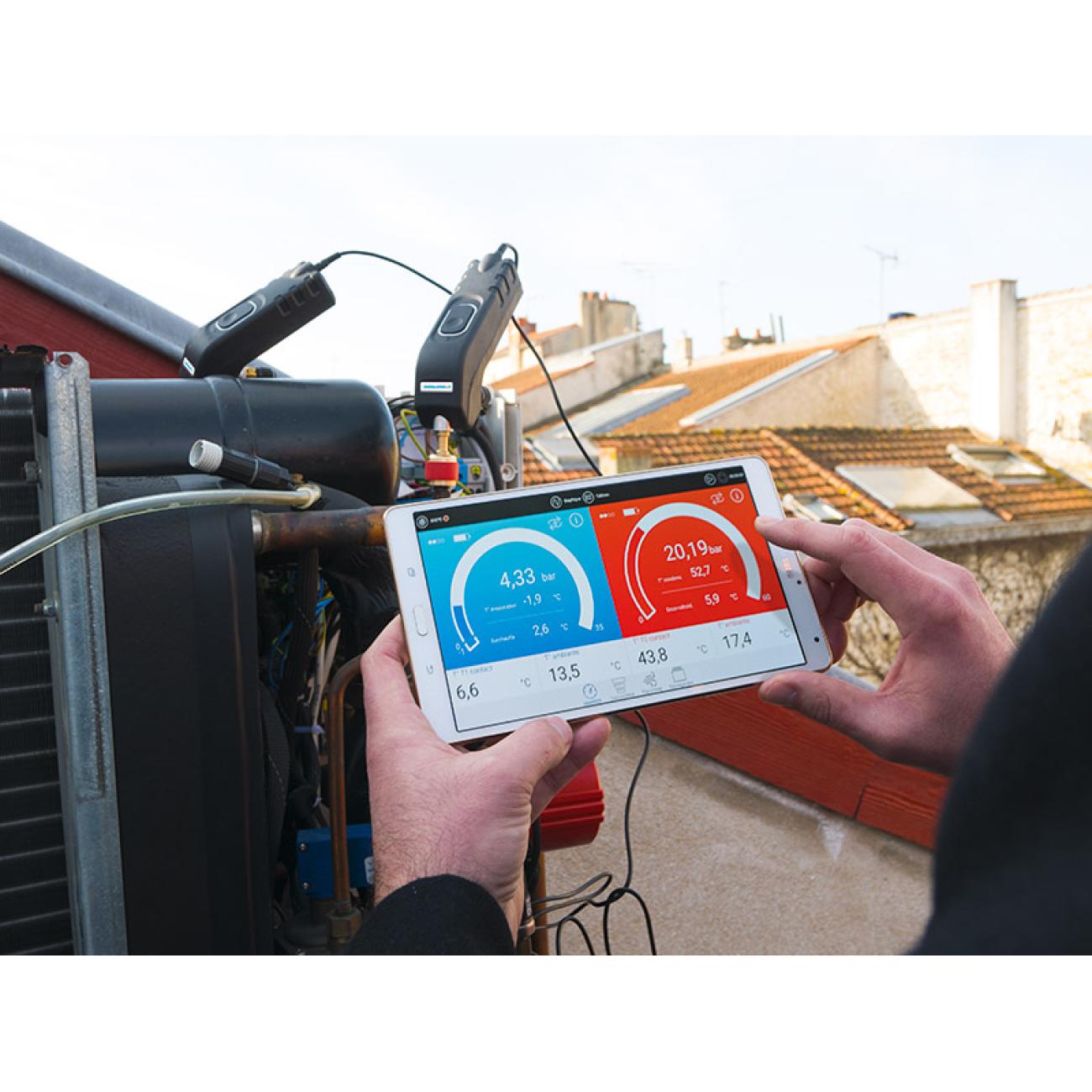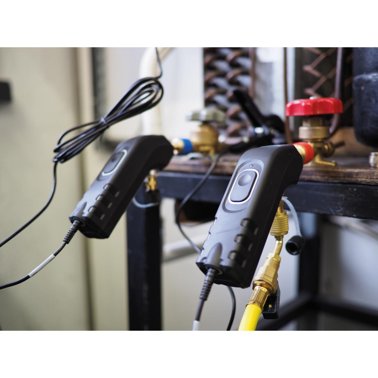 The Si-RM3 manifold comes with two pressure probes that accurately measure high side and low side pressure and two temperature probes that are used to accurately and simultaneously provide real-time superheat/sub cooling calculations.