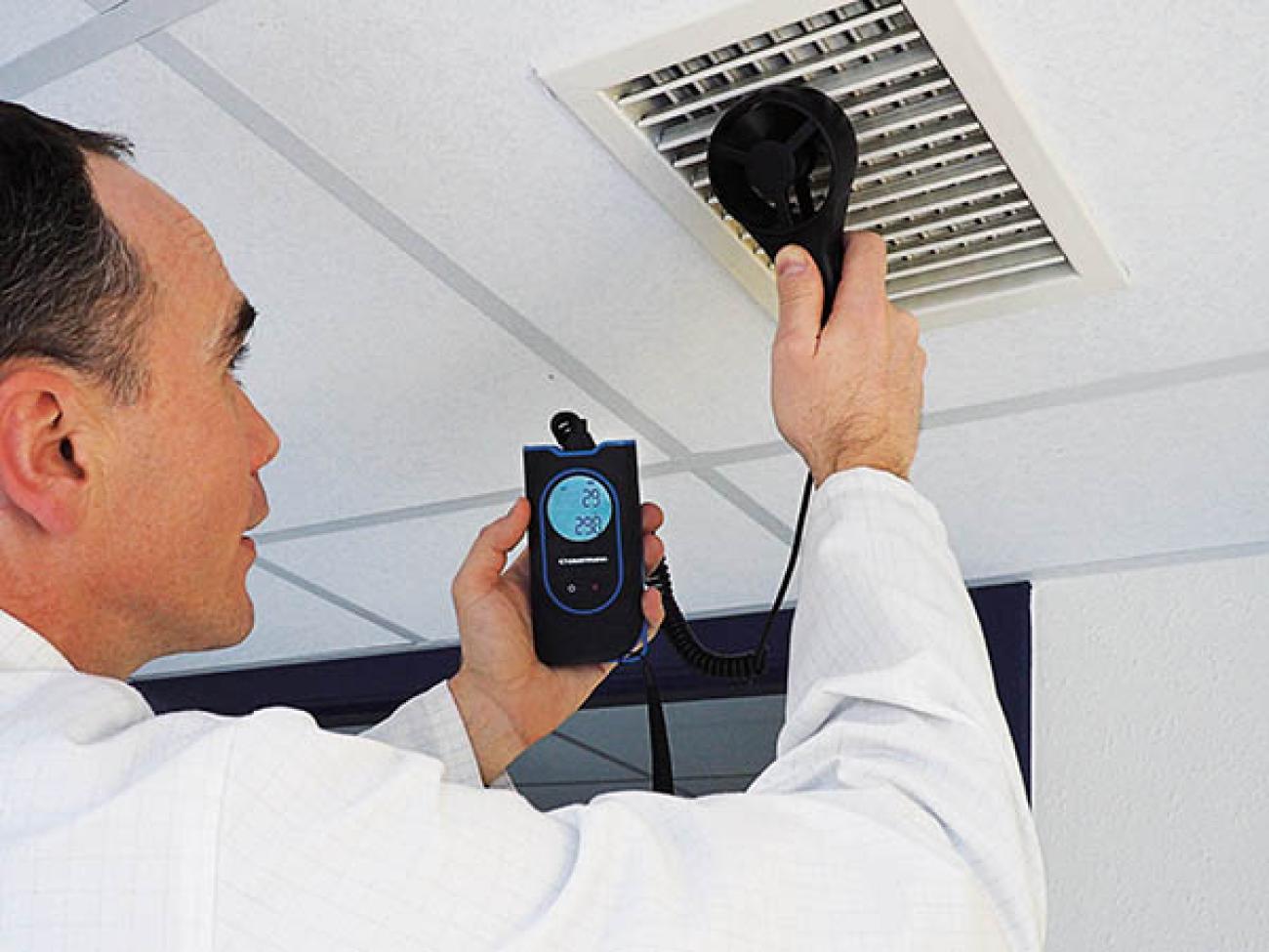 The palm-sized Sauermann Si-VV3 vane thermo-anemometer easily measures airflow, air velocity & temperature with its vane probe.